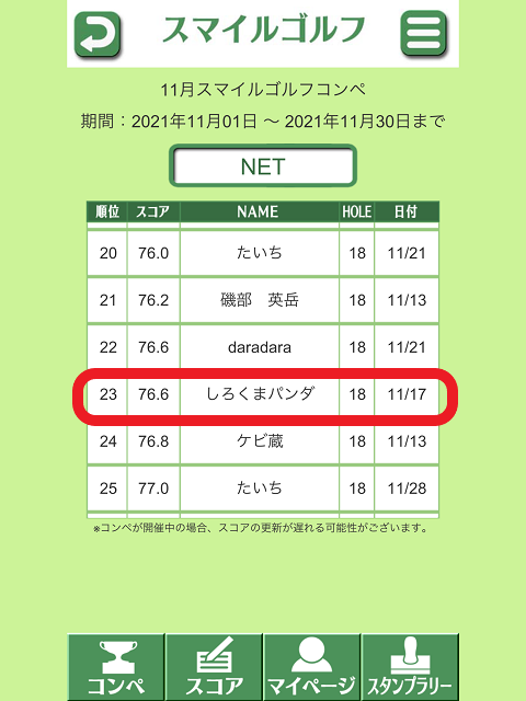 GROSSの順位や途中の詳細順位はアプリでご覧いただけます。アプリトップから「10月スマイルゴルフコンペ」を選択します。