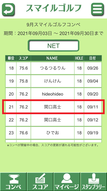 GROSSの順位や途中の詳細順位はアプリでご覧いただけます。アプリトップから「8月スマイルゴルフコンペ」を選択します。
