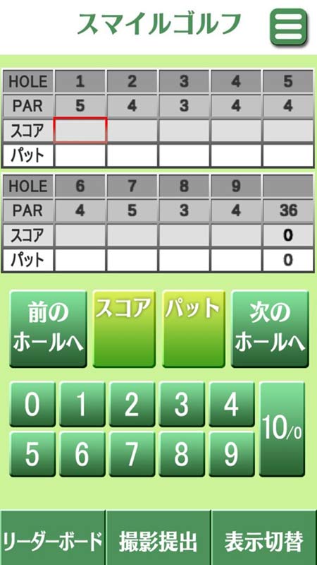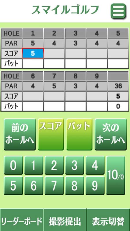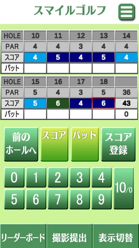 - スコアを入力します。スコアは数字ボタンを選択して、「次のホール」を押してください。修正したい場合は、「前のホール」または「次のホール」を選択して、赤いカーソルを移動して、数字を入力してください。パットは入力しなくても大丈夫です。