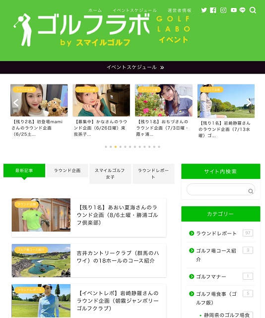事業紹介ゴルフラボ・イベントサイト golf2525 2022年6月9日 ゴルフ女子のラウンド企画の開催情報やラウンド企画レポート、また笑顔が素敵なゴルフ女子、スマイルゴルフ女子のご紹介、ゴルフ場ランチ、ゴルフ旅行、ゴルフ場コース紹介などをまとめております。https://www.golflab.tokyo/